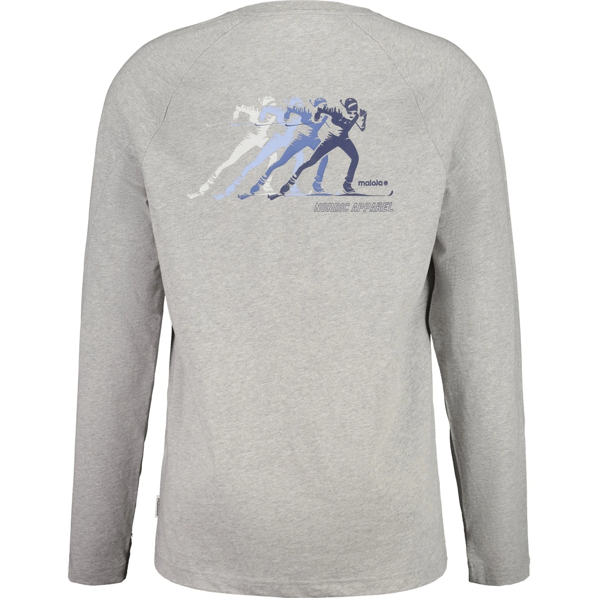 Long-sleeved shirt made of organic cotton with modern design: raglan sleeves and set ribbed cuffs and collar. Large cross-country print on the back, Maloja patch on the chest.