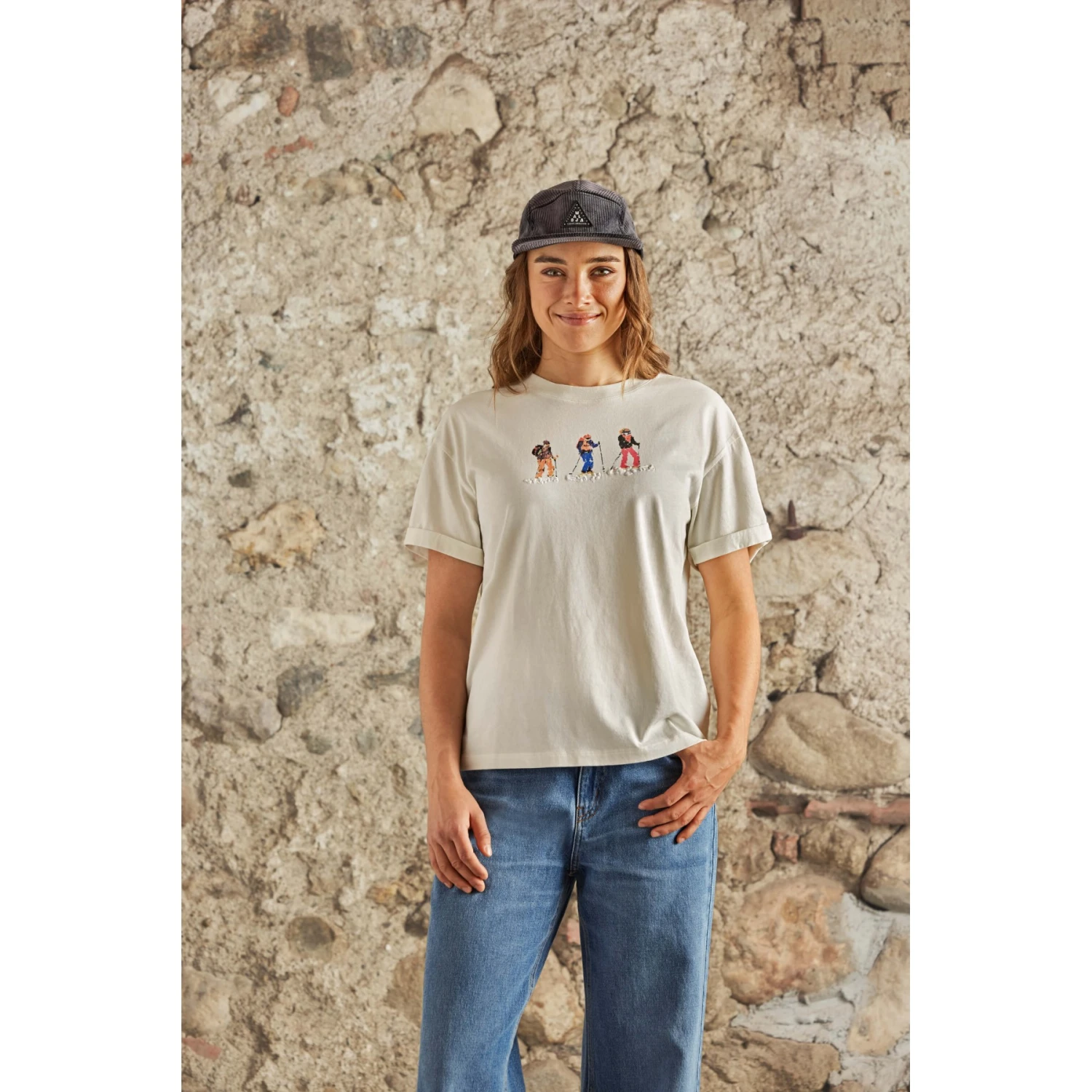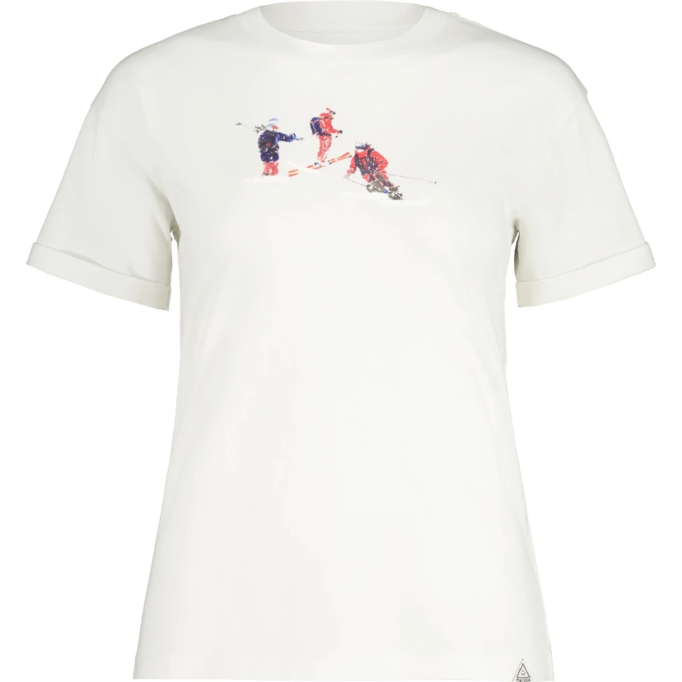 Basic T-shirt with rolled-up sleeves in organic cotton, decorated with three hand-drawn 3D prints: ski touring, freeride or cross-country skiing.