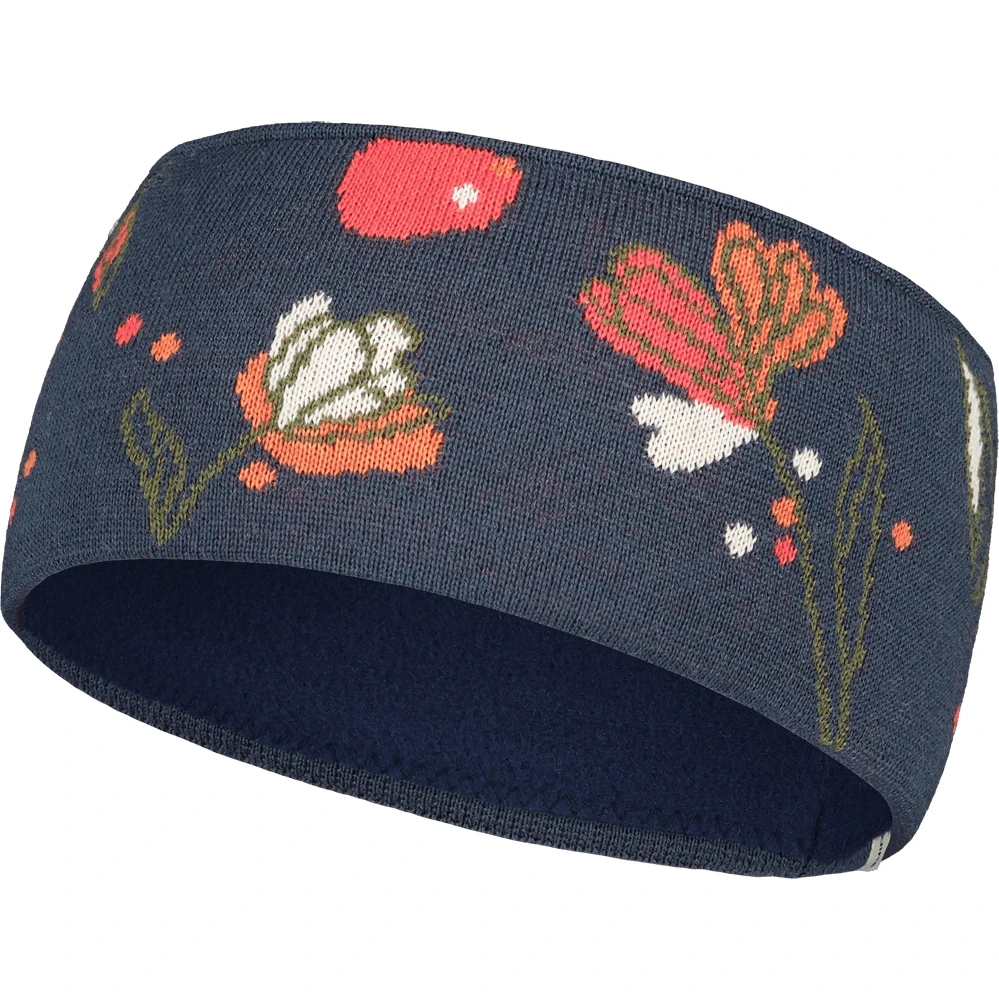 Warm wool blend headband with fleece lining inside and knit-in floral pattern. Vertical Maloja label on the edge.