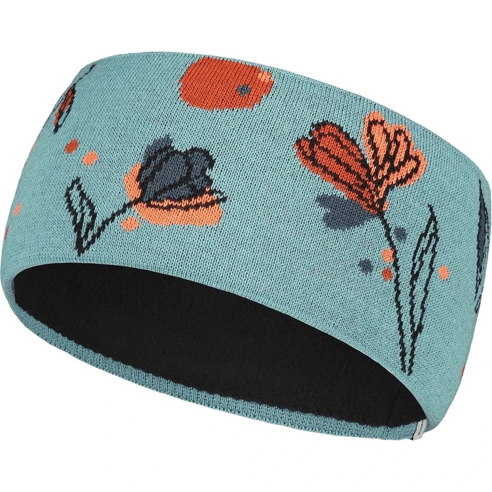 Warm wool blend headband with fleece lining inside and knit-in floral pattern. Vertical Maloja label on the edge.