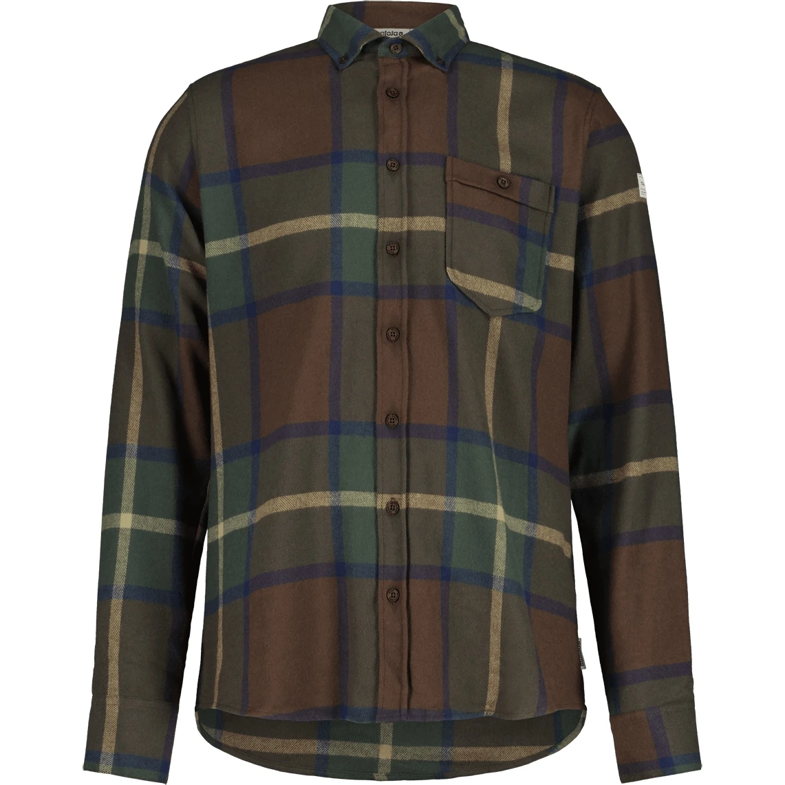 Organic cotton flannel shirt, button-down collar, patch chest pocket, modern back yoke, Maloja label on the upper left arm.